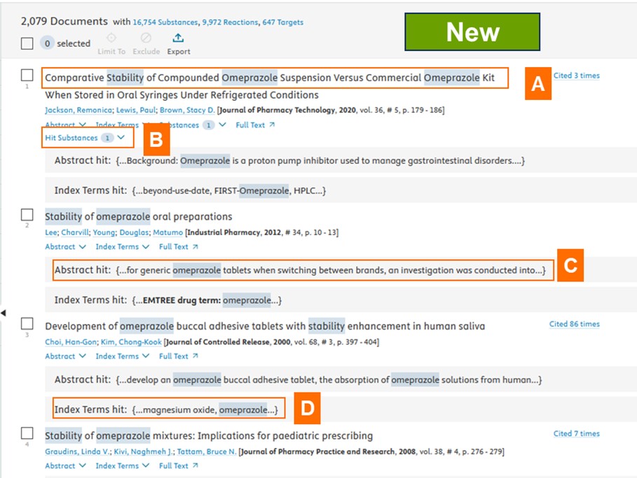 As part of our extraction process there are many important keywords and concepts, which are extracted from the full text literature. These you normally see in the “Index terms” section (D) of a document. We have made some changes to how our text search functionality works whereby more of these important concepts are better recognised during a search. This coupled with improvements to relevancy ranking ensures enhanced discoverability of the most relevant answers to your research questions.