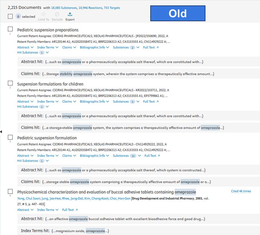 Here is an example of the results returned for the newly implemented algorithm versus previous ranking system: Example query “Stability of omeprazole”.