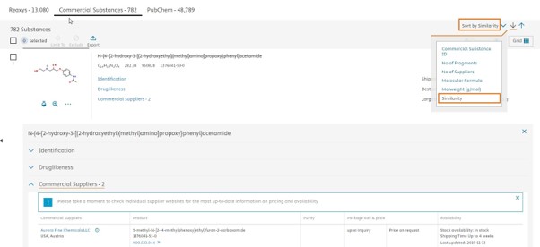 All commercial substance search results will have the option to be sorted by similarity score. This option will be accessible via the dropdown menu on the results page beside the other sorting options. For substance similarity searches the results set will be sorted by their similarity score by default. Using this new sorting option makes it easier to find commercially available similar building blocks and therefore accelerates synthesis processes.