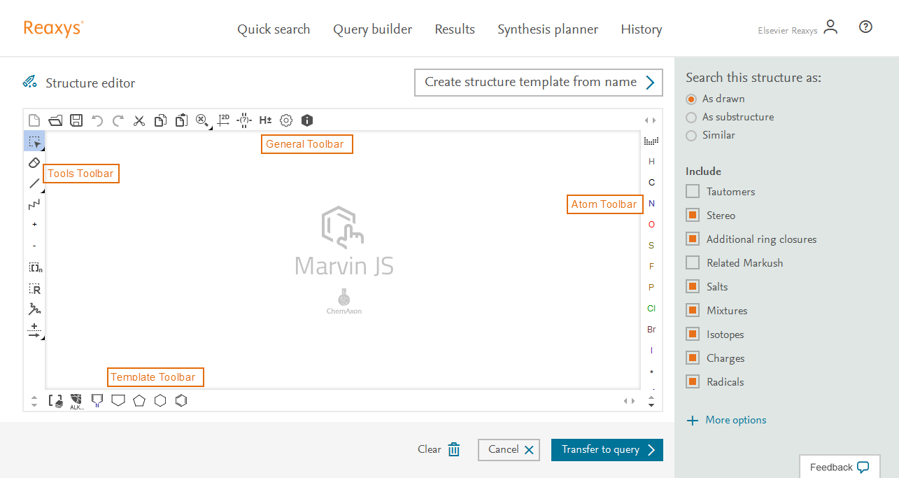 The 'Create Structure or Reaction Drawing' box On the Reaxys home page click the Create Structure or Reaction Drawing box to open the structure editor (Marvin JS from ChemAxon).The Marvin JS structure editor is displayed: