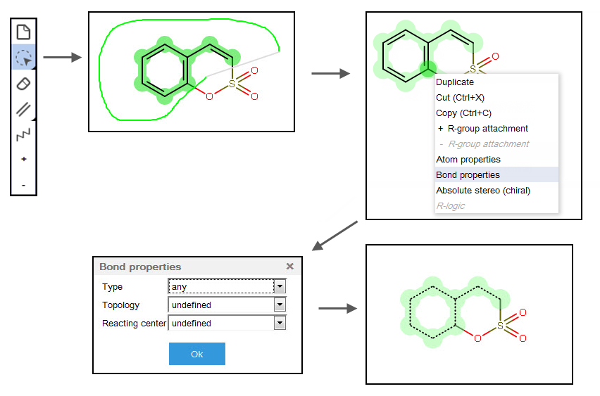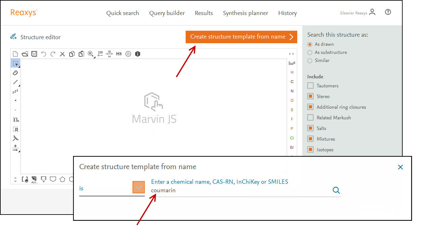 This workflow will show different ways to create a Structure Drawing for coumarin, as well as the ability to copy and paste it from external editors. It will also show how to add various query features to the drawing using the Reaxys structure editor Marvin JS from ChemAxon.