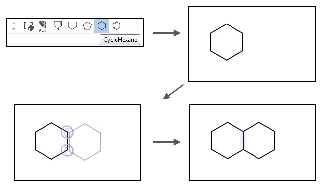 - Append a second template to the existing one: click and drag on the canvas. A grey structure will appear to show the position of the new template. When the dragged substructure element gets close to the other, a purple highlight will appear on the atoms’ corners. Release your mouse button and the two bonds will automatically be merged together.