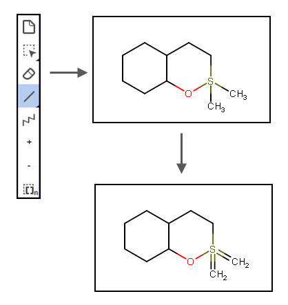 - Click ‘S’ in the atom toolbar, click the ‘C’ atom,