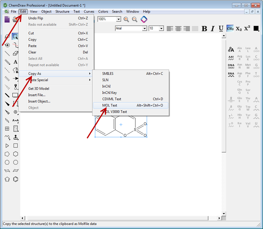Coumarin structure in Chemdraw editor - Select the structure or reaction, go to the Edit menu at the top and select ‘Copy As’.