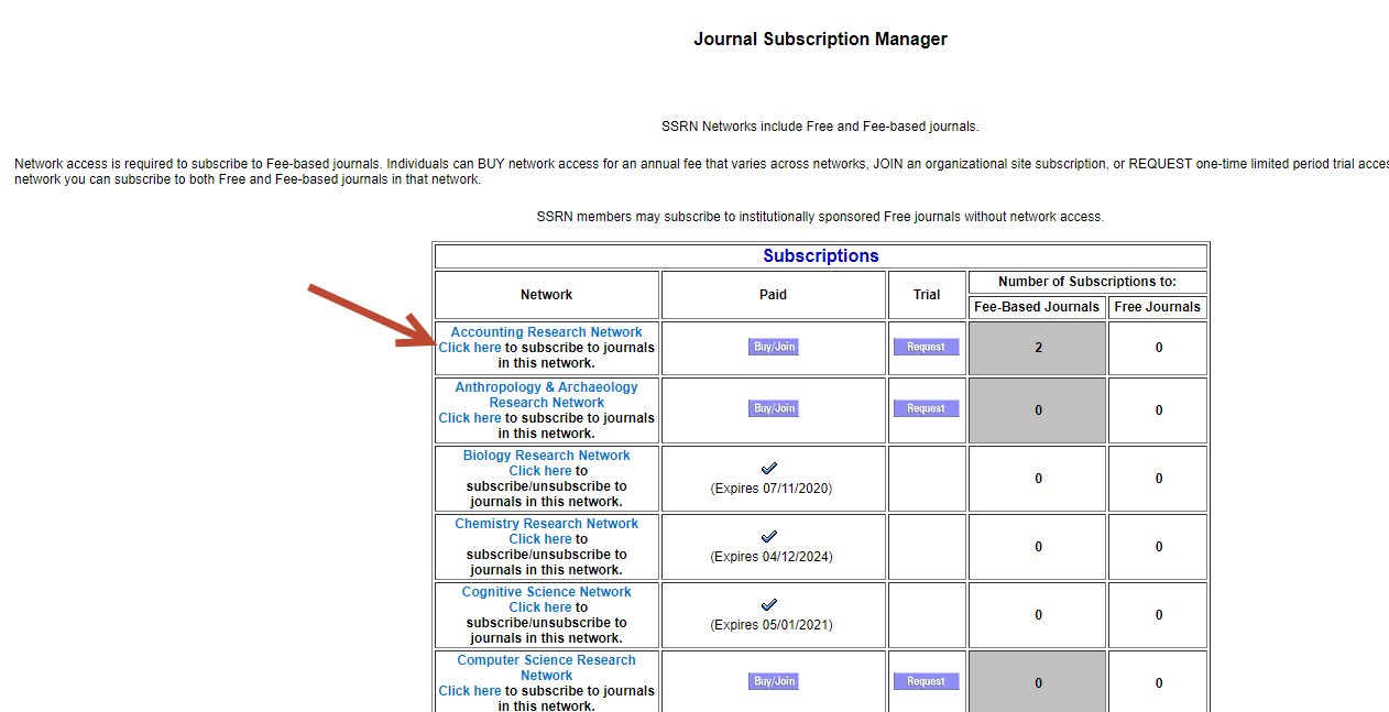 From the Journal Subscription Manager page located in HQ, select the 'Click here' button under the network research area you are currently subscribed to.
